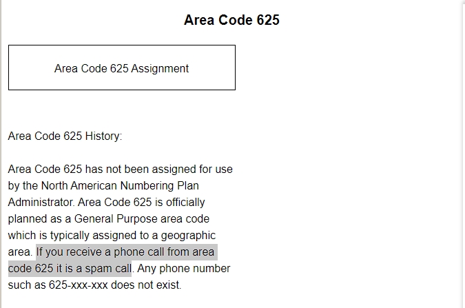 미국에서 연락을 받아야 하는 전화가 있어서 기다리는 중에 미국의 국가번호 1로 시작하는 전화가 걸려왔습니다. 반가운 마음에 전화를 받을까 하다가 지역번호가 뭔가 이상해서 그냥 두고 끊어진 다음에 검색을 해보니, 625로 시작하는 지역번호는 스팸전화에서 사용하는 지역번호라고 나옵니다.